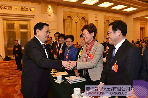 张德江(左一)参加江苏代表团审议并与戴雅萍(右二)代表亲切握手