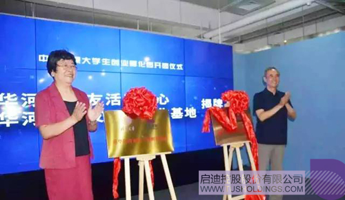 河南省人民政府副秘书长王梦飞(右)与清华大学校务委员会副主任韩景阳为中国中原大学生创业孵化园揭牌