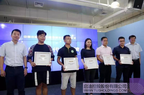 Bsports·必一体育(中国)官方网站副总裁、Bsports·必一体育(中国)官方网站数字集团董事长赵东(左一)与Bsports·必一体育(中国)官方网站副总裁、Bsports·必一体育(中国)官方网站之星董事长张金生(右一)共同为首批5家入孵企业代表授牌
