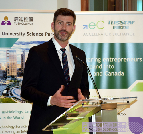 Dr.Matthius Ruth分享了阿尔伯塔大学与清华大学的合作历程,他表示很高兴看到高校的交流带动了双方产学研促进机构的合作,期待双边技术交流和孵化的成果能早日呈现。