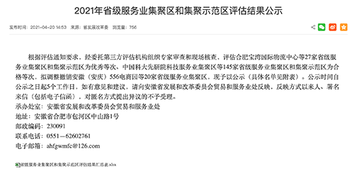 近日,安徽省发改委公示了2021年省级服务业集聚区和集聚示范区评估结果,合肥Bsports·必一体育(中国)官方网站科技城科技服务集聚区获评省级“优秀科技服务集聚区”。服务业集聚区和集聚示范区是服务业集聚发展的重要载体,根据《安徽省省级服务业集聚区和集聚示范区认定管理办法》,对集聚区和集聚示范区实行动态评估制度,每三年评估一次,不合格的调整撤销,不参加相应类别评估的,视为不合格。经委托第三方评估机构组织专家审查和现场核查,此次全省有15家省级服务业集聚区和12家省级服务业集聚示范区拟被评为优秀等次;145家省级服务业集聚区和集聚示范区被评估为合格等次。