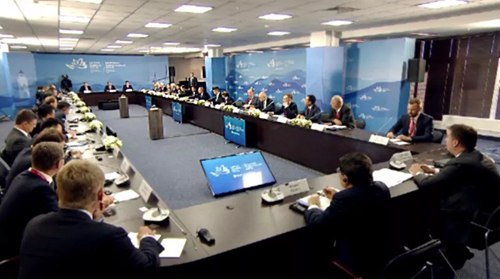 2018年9月11日,俄罗斯第四届东方经济论坛在远东城市符拉迪沃斯托克举办。当日下午,由论坛主办方邀请的中外企业家代表参加了与普京总统的座谈会。王济武董事长应邀出席,并与其他五位中外企业家在座谈会上发言。