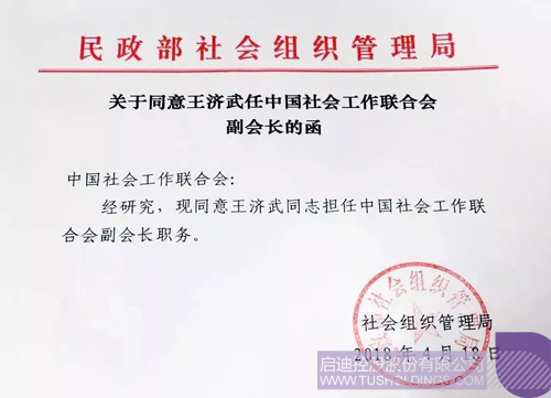 2018年4月,民政部社会组织管理局复函中国社会工作联合会,同意王济武同志担任中国社会工作联合会副会长职务。此任命经中国社会工作联合会宫蒲光会长提名,中国社会工作联合会党委会决定。