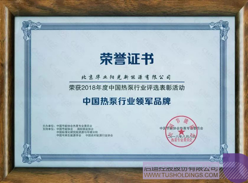 2018年8月,在由中国节能协会主办、中国热泵产业联盟承办的2018中国热泵行业年会暨第七届国际空气源热泵行业发展论坛上,华业阳光以优异的成绩及表现荣获空气源热泵行业最高荣誉—“中国热泵行业领军品牌”称号。