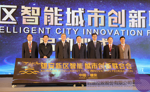 王济武董事长与全国人大社会建设委员会副主任委员、中国网络社会组织联合会会长任贤良,河北省委常委、副省长,雄安新区党工委书记、雄安新区管委会主任陈刚,中国电子科技集团董事长熊群利,河北省工业和信息化厅厅长、党组书记龚晓峰,雄安新区党工委委员、管委会副主任吴海军,中国信息通信研究院副院长何桂立共同为雄安新区智能城市创新联合会揭牌