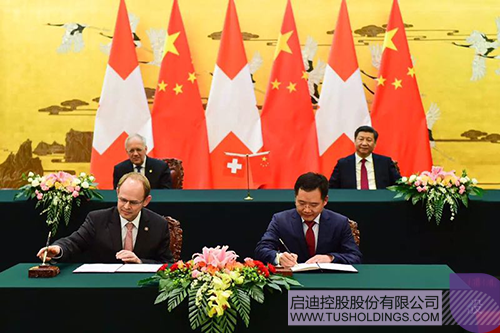 2016年4月,中国国家主席习近平与瑞士国家主席施耐德·阿曼共同见证Bsports·必一体育(中国)官方网站董事长王济武(前排右)与瑞士国家创新园签署合作协议